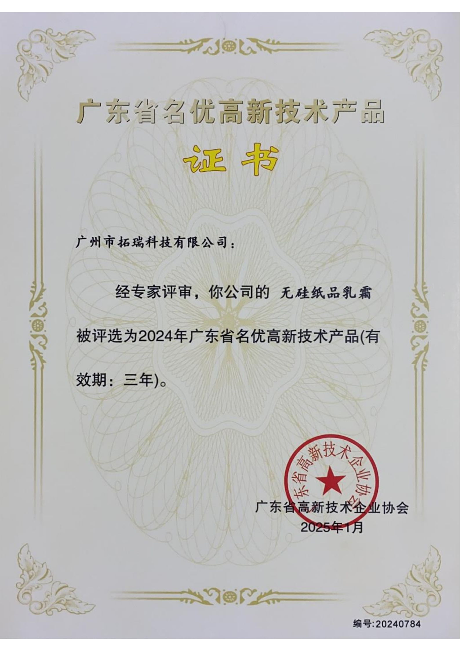 近日,拓瑞科技旗下2款產(chǎn)品:無硅紙品乳霜、冷鏈用復(fù)合消毒劑評(píng)選為“2024年廣東省名優(yōu)高新技術(shù)產(chǎn)品”