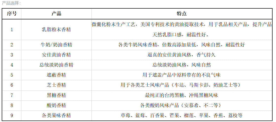 我公司在植脂奶油、烘焙、植脂末、飲料、冰激凌等領(lǐng)域有獨特的風(fēng)味、口感類香精調(diào)香方案,現(xiàn)為多家國內(nèi)外品牌企業(yè)提供服務(wù)。